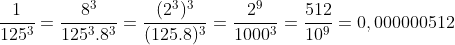 | Schrijf \(\large\boldsymbol{\frac{1}{125^3}}\) in decimale vorm. Wat is dan het eerste cijfer na de komma dat NIET nul is ? | A. 1 |